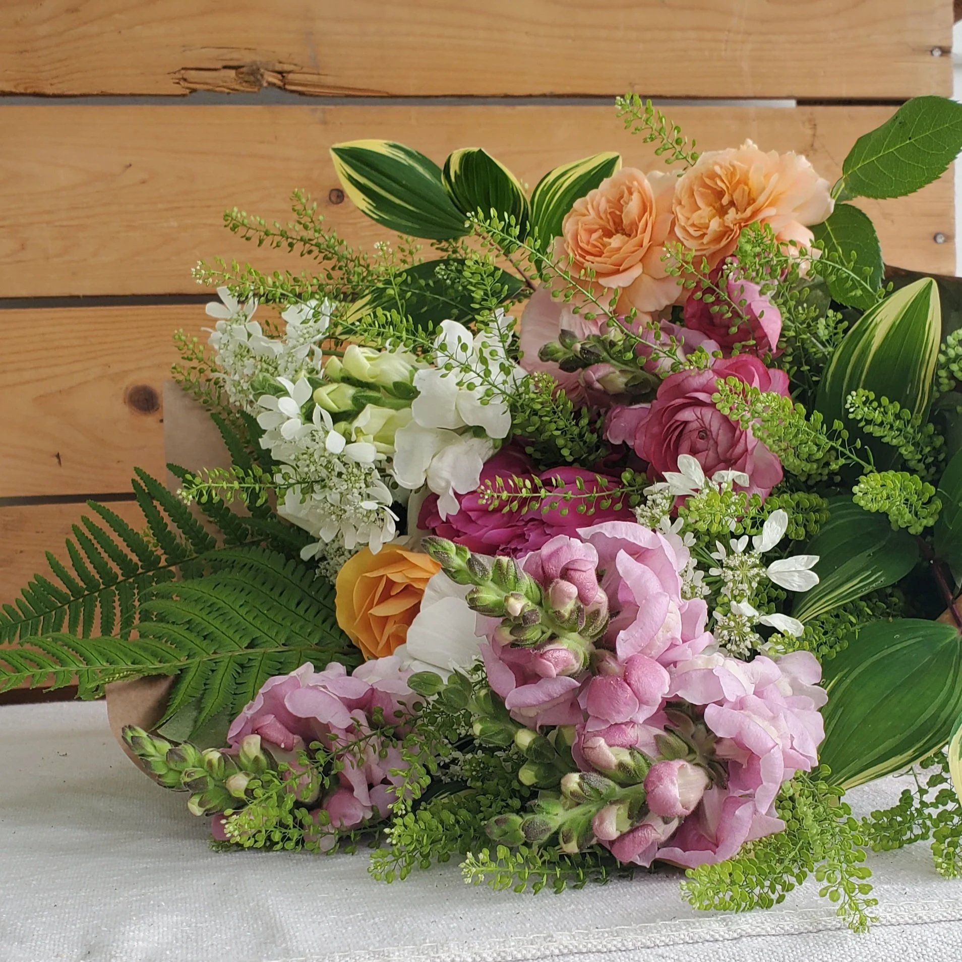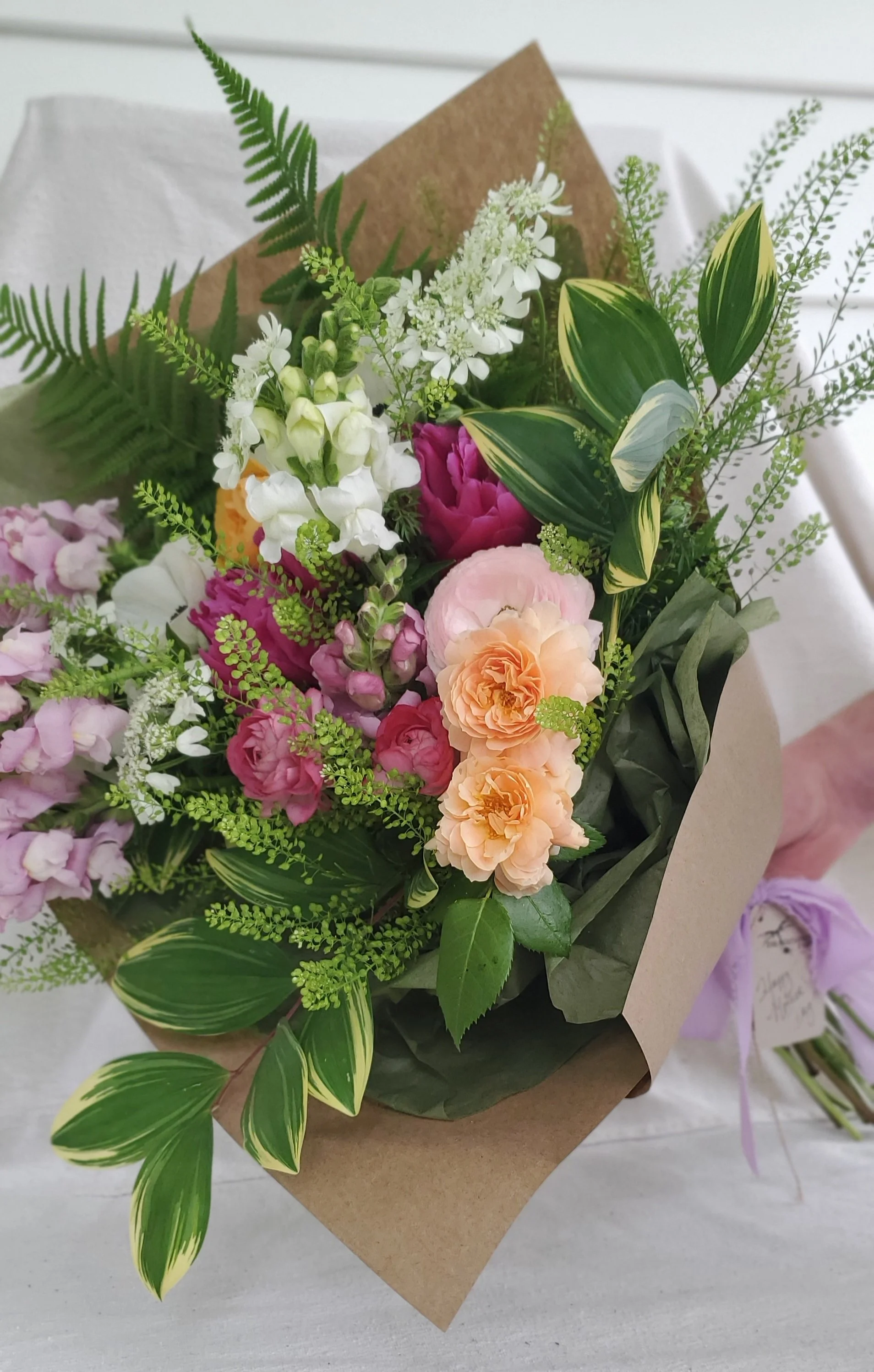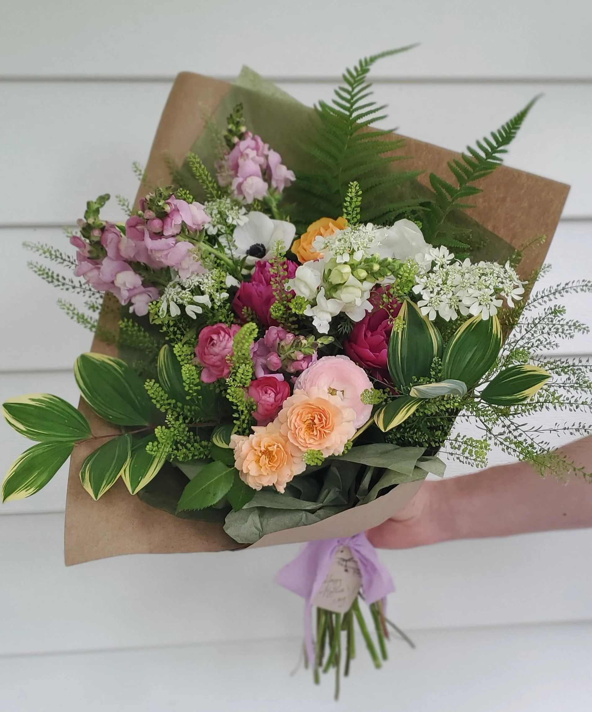Show mom some love with a deluxe bouquet of locally grown beauty! Lush with seasonal blooms including peonies, snapdragons, ranunculus and more. Each bouquet comes in our signature kraft wrap and tied with a ribbon. Flower selection and color palette are designer’s choice