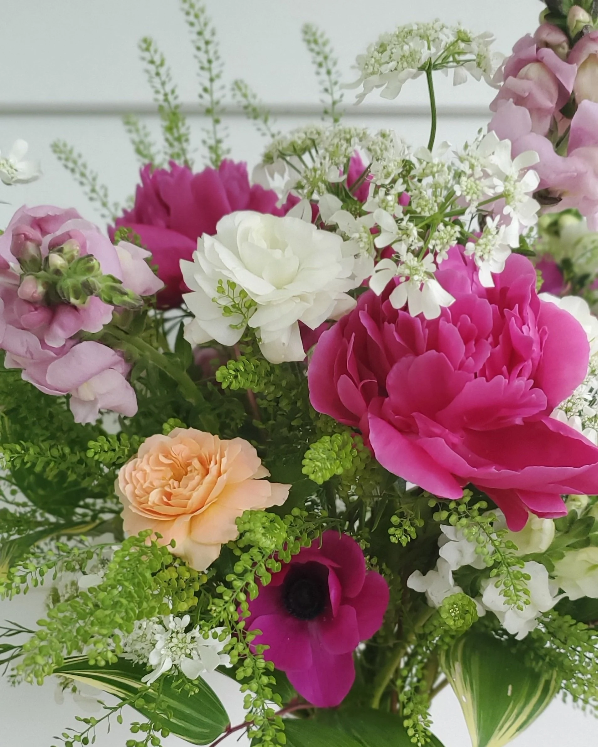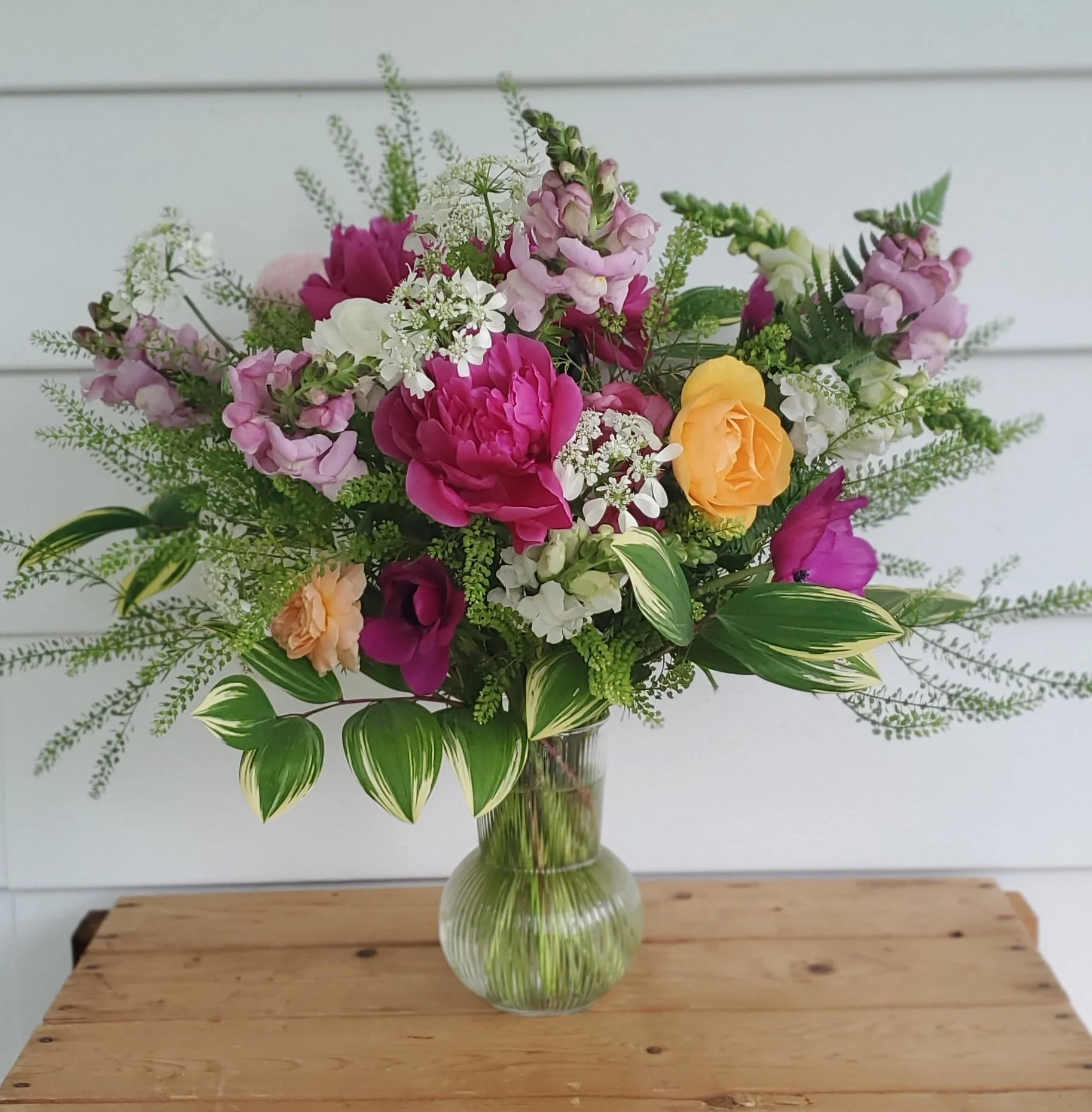 Show mom some love with a garden-inspired arrangement of locally grown beauty! Lush with seasonal blooms including peonies, snapdragons, ranunculus and more, each arrangement comes in an elegant, fluted vase. Flower selection and color palette are designer’s choice.